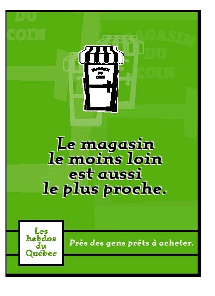 Il en est sorti une campagne divertissante et percutante, comprenant deux visuels affichés dans les toilettes des agences membres du réseau Zoom en juin et deux séries de quatre messages magazine qu'on retrouve dans Info Presse. On a aussi placé de petits bandeaux dans l'incontournable Grenier aux nouvelles. Toute la communication est axée sur la proximité des hebdos locaux des consommateurs et des lieux de vente : ainsi, on peut apprendre que la crème glacée fond moins quand on l'achète plus proche ou que l'endroit le plus connu du globe, c'est son coin. Des vérités à la Légaré, illustrées par Alain Roy, de Loup Garou Design, un fidèle collaborateur de Commando Création, à l'aide de petits icones sympas sur des fonds de couleurs éclatantes.