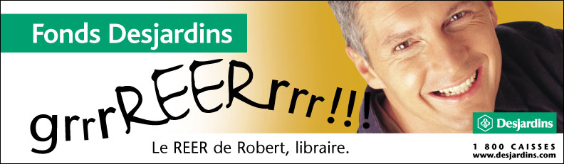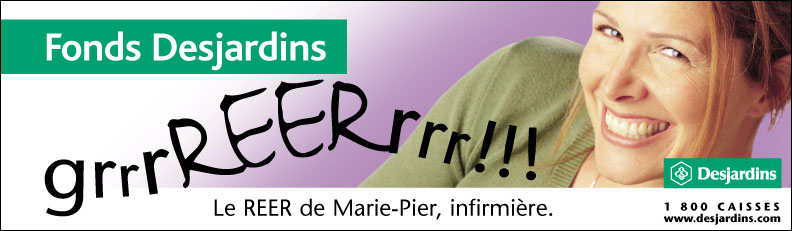 De nouveaux concepts ont été réalisés pour Fonds Desjardins. Toujours en continuité avec les applications précédentes, le texte fait cette fois rimer le son ré-er avec des prénoms et des professions, astuce qui a bien plu à Johanne Brousseau, de Fiducie Desjardins, qui avait bien accueilli le texte du dépliant réalisé pour les REE il y a quelques semaines.