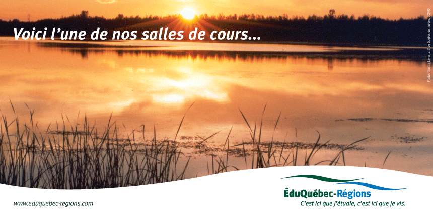 Je suis particulièrement fier des affiches, que l'on s'arrache, m'a-t-on dit, dans les salons tenus à l'étranger : des images des régions illustrent d'une manière surprenante les différents locaux qu'on peut trouver dans les établissements d'enseignement. Voici l'une de nos salles de cours, peut-on lire sur l'image d'un lever de soleil doré; Voici l'un de nos centres sportifs, sur l'image d'un sentier de ski de fond. Et ainsi de suite.