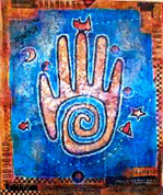 C'est donc avec un grand plaisir que je renoue avec ce peintre. La main, symbole du Salon des métiers d'art depuis l'an dernier, est ici entourée d'icones de Gérard : le chat, le poisson, la lune, mais aussi la fusée de l'écusson que portait l'astronaute Julie Payette lors de son premier voyage dans l'espace. Si vous êtes intéressé à vous associer au Salon des métiers d'art 1999, appelez-moi au (514) 994-1080 ou consultez la page Partenaires du Salon 1999.
