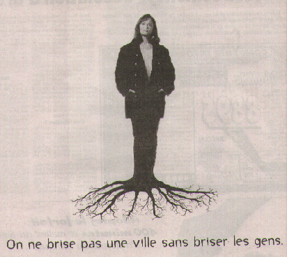 Je voulais un slogan qui réponde du tac au tac à celui de Pierre Bourque. J'ai pensé à ce qu'on pourrait appeler un effet miroir. Bourque prône l'unicité (l'unique cité, une ville), j'ai répondu par la diversité : Une île, diverses cités. Les maires de banlieue sont ravis. Je leur donne une réponse positive, reflétant en un slogan les différences qui caractérisent les 29 villes de banlieue de l'île de Montréal. Les personnages-racines de Michèle, accompagnés du titre percutant de Roger, On ne brise pas une ville sans briser les gens ont donné le ton avec des témoignages remplis d'émotion de citoyens qui ne veulent pas être déracinés. Quant à la deuxième exécution, elle s'appuie sur des arguments : illustré par un moule à petits pains d'épices, mon titre clame Pourquoi vouloir mettre tout le monde dans le même moule?.