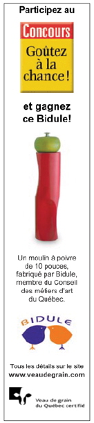 J'ai aussi conclu une entente avec quelques artisans du Conseil des métiers d'art du Québec pour mettre certains produits associés à la cuisine en vedette. On a commencé avec Bidule, qui a offert comme prix, pour le concours Goûtez à la chance, une magnifique poivrière architecturale, pour poursuivre avec Bruno Andrus, et l'un de ses superbes bols à double parois.