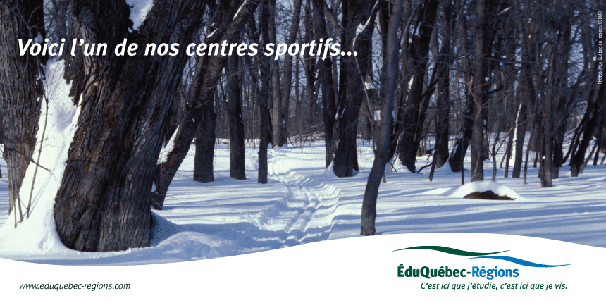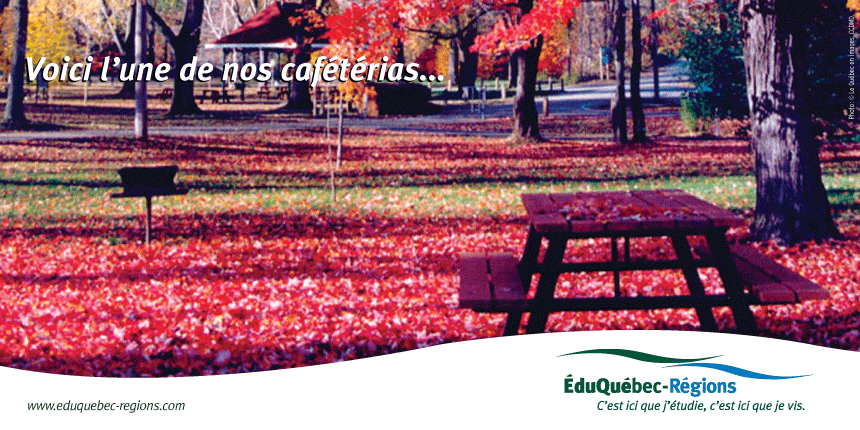 Je suis particulièrement fier des affiches, que l'on s'arrache, m'a-t-on dit, dans les salons tenus à l'étranger : des images des régions illustrent d'une manière surprenante les différents locaux qu'on peut trouver dans les établissements d'enseignement. Voici l'une de nos salles de cours, peut-on lire sur l'image d'un lever de soleil doré; Voici l'un de nos centres sportifs, sur l'image d'un sentier de ski de fond. Et ainsi de suite.