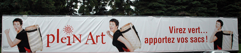On a cependant ajouté le message Virez vert... apportez vos sacs! aux communications. Un autre pas dans la bonne direction... logique pour des artisans du commerce équitable et du développement durable! Et pour la première fois, nous avons habillé la roulotte qui sert de bureau à l'organisation du salon, profitant ainsi d'une surface de 60 pi x 9 pi pour afficher le nouveau message écolo.