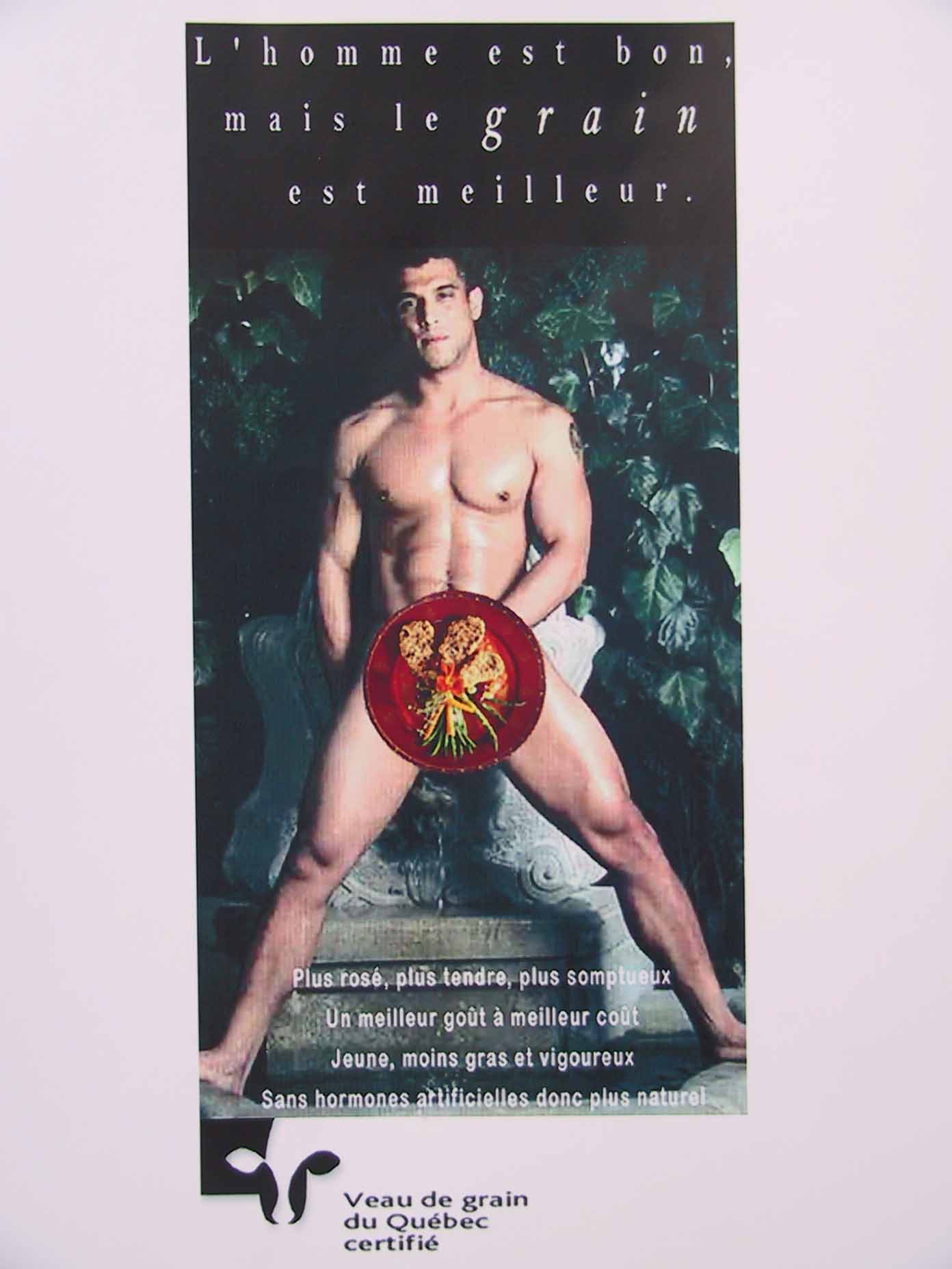 À notre grande surprise, nous avons constaté que plus de la moitié des travaux portait sur la séduction. Ils mettaient en scène des femmes charmées par les attributs du produit, tout en laissant d'abord croire qu1il s'agissait d'un homme! Ce filon a d'ailleurs été exploité au maximum quand une équipe de trois jeunes filles nous ont présenté un homme nu, se cachant le sexe avec une assiette mettant en vedette le veau de grain... Le titre s'inspirait d'une citation de Bertolt Brecht : L'homme est bon, mais le veau est meilleur.